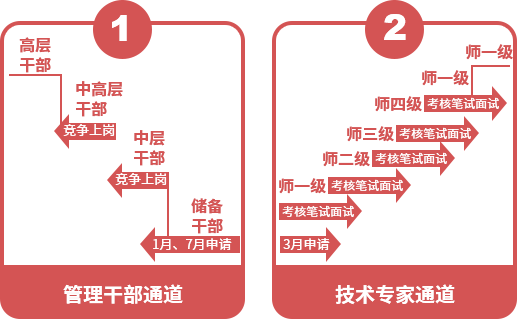 根据员工个人不同的特质,公司为员工发展规划专业发展方向和管理发展方向的职业发展通道,为员工提供广阔的发展空间。