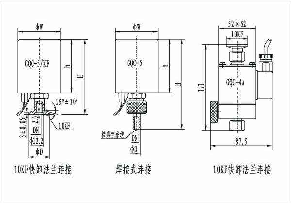 GQC-1.5 GQC-5型电磁高真空充气阀是以电磁力为动力,当接通电源时,阀门被关闭,使真空系统与大气隔离;切断电源时,阀门处于开启状态,随之大气由外界引入真空系统。GQC-4A型电磁高真空充气阀具有通电开启和通电关闭两种功能,阀内带有空气过滤器,可用作向真空系统充气。
